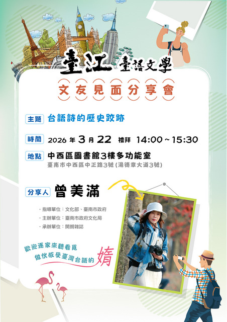前幾日仔(2026/03/22),由臺南市政府文化局主辦,開朗雜誌(真平語文相關企業)承辦的臺江臺語文友見面分享會,這期邀請曾美滿老師,佇臺南市中西區圖書館分享伊台語詩創作的過程。